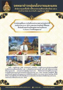 วันที่ 4 พฤศจิกายน 2568 นายสมพงษ์ แสนสำโรง รองผู้อำนวยการสำนักงานเขตพื้นที่การศึกษาประถมศึกษาเชียงใหม่ เขต 4           พร้อมด้วยนางสาวนงนภัส แก้ววงศ์ดี ผู้อำนวยการกลุ่มนโยบายและแผน และบุคากรกลุ่มนโยบายและแผน ได้เข้าร่วมการประชุมชี้แจงแนวทางการจัดตั้งคำของบประมาณรายจ่ายประจำปีงบประมาณ พ.ศ. 2570 งบลงทุน ค่าครุภัณฑ์ ที่ดินและสิ่งก่อสร้างของโรงเรียนคุณภาพ ผ่านสื่ออิเล็กทรอนิกส์ ระบบ Zoom Cloud Meeting เพื่อให้สำนักงานเขตพื้นที่และโรงเรียนได้เตรียมความพร้อมในการดำเนินการจัดตั้งคำของบประมาณรายจ่ายประจำปีงบประมาณ พ.ศ. 2570