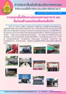 วันที่ 27 ตุลาคม 2568 นายสมพงษ์ แสนสำโรง รองผู้อำนวยการสำนักงานเขตพื้นที่การศึกษาประถมศึกษาเชียงใหม่ เขต 4 พร้อมด้วยนางสาวนงนภัส แก้ววงศ์ดี ผู้อำนวยการกลุ่มนโยบายและแผน และบุคลากรกลุ่มนโยบายและแผน ออกพื้นที่ติดตาม ตรวจสภาพอาคารและสิ่งก่อสร้างของโรงเรียนในสังกัด เพื่อรับทราบข้อมูลสภาพปัจจุบัน ปัญหาและความต้องการของโรงเรียน ในการพิจารณาจัดตั้งงบประมาณ งบลงทุน รายการค่าครุภัณฑ์ ที่ดินและสิ่งก่อสร้าง ประจำปีงบประมาณ พ.ศ. 2570 ณ โรงเรียน วัดช่างคำ บ้านสันทราย วัดจอมทอง บ้านวังศรี บ้านป่าตาล และบ้านสันผักหวาน อำเภอหางดง สำนักงานเขตพื้นที่การศึกษาประถมศึกษาเชียงใหม่ เขต 4