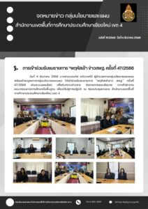 วันที่ 4 ธันวาคม 2568 นางสาวนงนภัส แก้ววงศ์ดี ผู้อำนวยการกลุ่มนโยบายและแผน พร้อมด้วยบุคลากรกลุ่มนโยบาย และแผน ได้เข้าร่วมรับชมรายการ “พฤหัสเช้าข่าว สพฐ.” ครั้งที่ 47/2568 ผ่านระบบออนไลน์ เพื่อรับทราบข่าวสาร ข้อราชการ และนำนโยบายไปสู่การปฏิบัติ ณ ห้องประชุมหางดง สำนักงานเขตพื้นที่การศึกษาประถมศึกษาเชียงใหม่ เขต 4