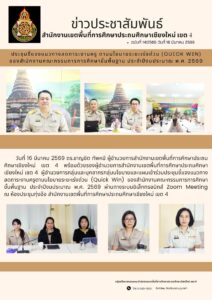 วันที่ 16 มีนาคม 2569 ดร.ชาญชิต ทัพหมี ผู้อำนวยการสำนักงานเขตพื้นที่การศึกษาประถมศึกษาเชียงใหม่ เขต 4 พร้อมด้วยรองผู้อำนวยการสำนักงานเขตพื้นที่การศึกษาประถมศึกษาเชียงใหม่ เขต 4 ผู้อำนวยการกลุ่มและบุคลากรกลุ่มนโยบายและแผนเข้าร่วมประชุมชี้แจงแนวทางลดภาระครูตามนโยบายระยะเร่งด่วน (Quick Win) ของสำนักงานคณะกรรมการการศึกษาขั้นพื้นฐาน ประจำปีงบประมาณ พ.ศ. 2569 ผ่านทางระบบอิเล็กทรอนิกส์ Zoom Meeting ณ ห้องประชุมทุ่งอ้อ สำนักงานเขตพื้นที่การศึกษาประถมศึกษาเชียงใหม่ เขต 4