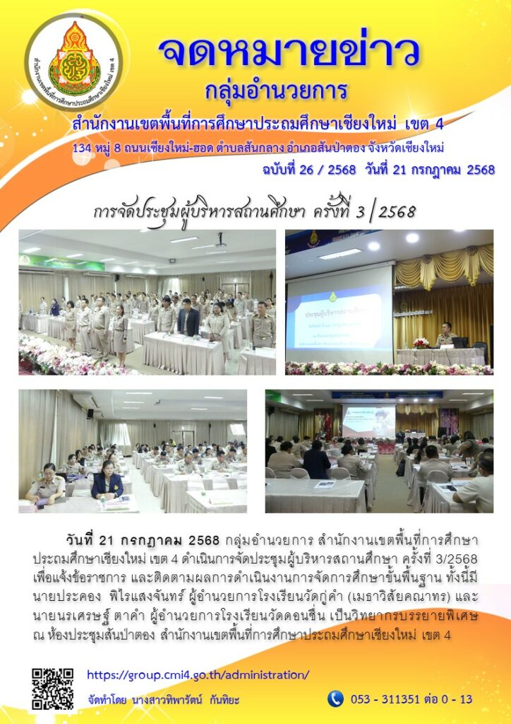 จดหมายข่าว ฉบับที่ 26/2568 การจัดประชุมผู้บริหารสถานศึกษา ครั้งที่ 3/2568 โพสต์โดย admin | ก.ค. 21, 2025 | จดหมายข่าว | 0 |