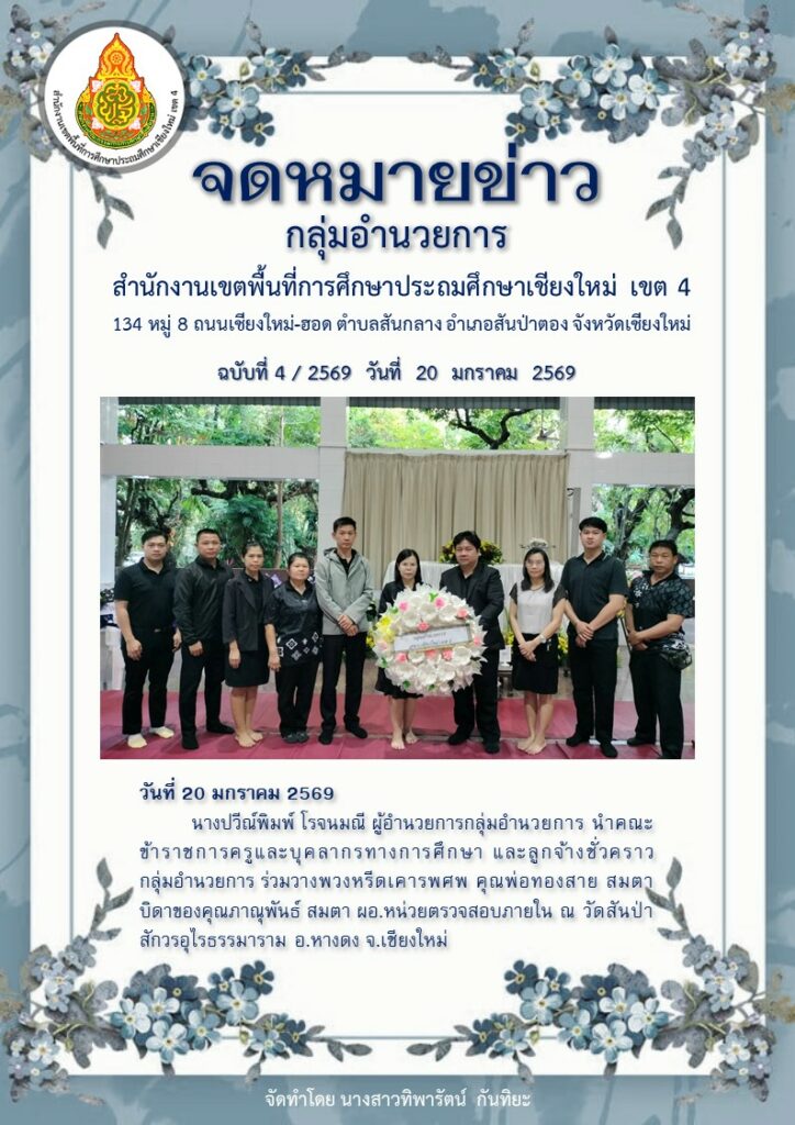 จดหมายข่าว ฉบับที่ 4/2569 กลุ่มอำนวยการ ร่วมวางพวงหรีดเคารพศพ คุณพ่อทองสาย สมตา บิดาของคุณภาณุพันธ์ สมตา ผอ.หน่วยตรวจสอบภายใน โพสต์โดย admin | ม.ค. 20, 2026 | จดหมายข่าว | 0 |